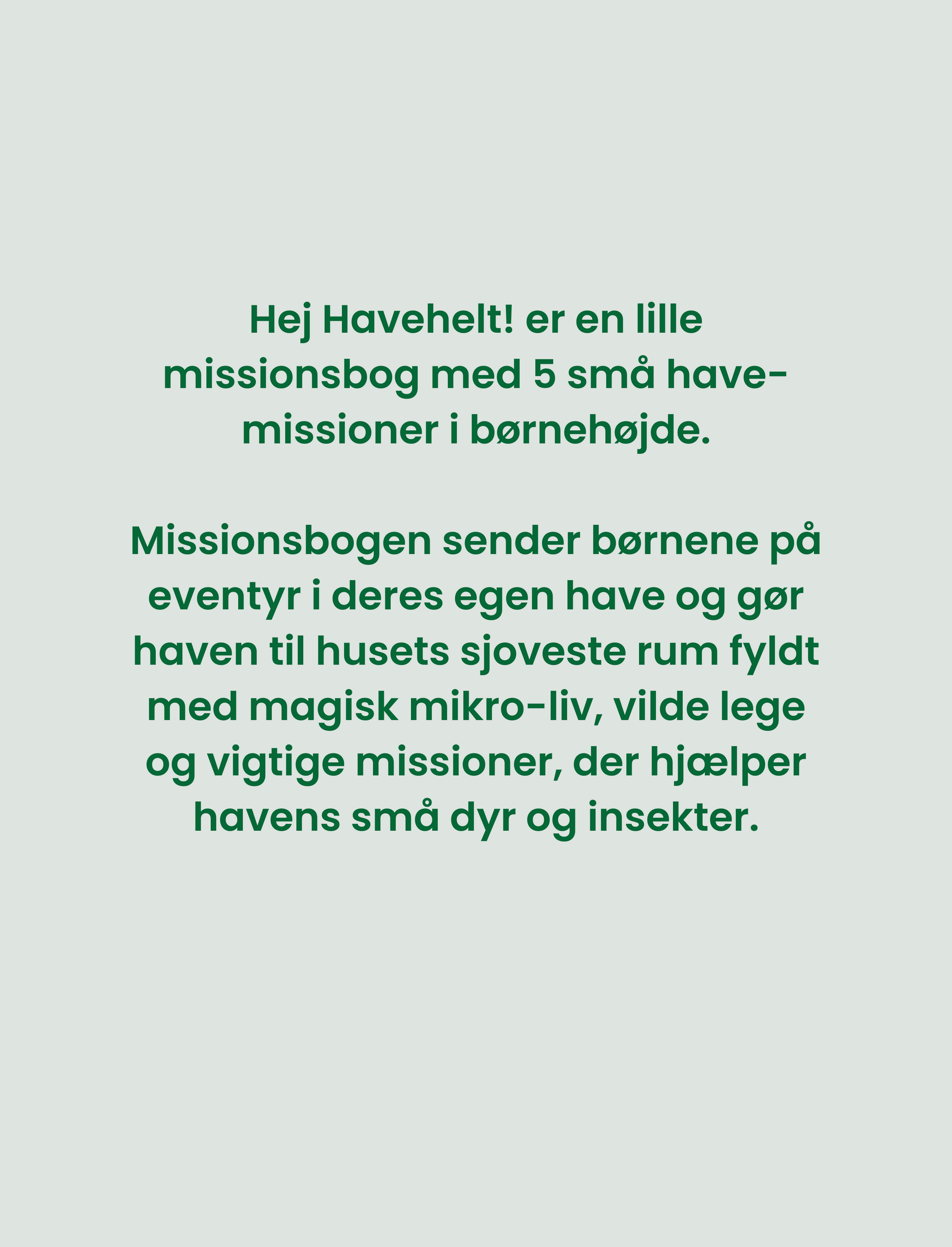 Hej Havehelt! er en lille missionsbog med 5 små have-missioner i børnehøjde.