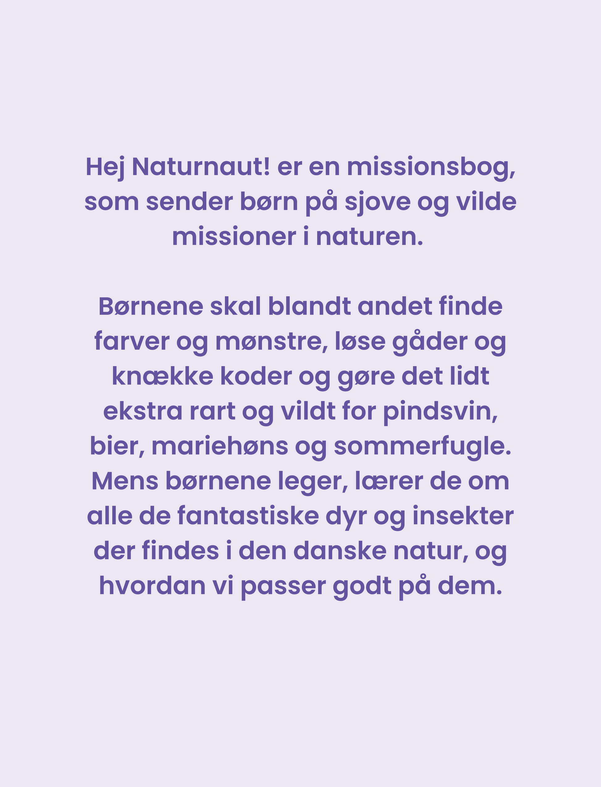 Hej Naturnaut! er en missionsbog, som sender børn på sjove og vilde missioner i naturen. Børnene skal blandt andet finde farver og mønstre, løse gåder og knække koder og gøre det lidt ekstra rart og vildt for pindsvin, bier, mariehøns og sommerfugle. Mens børnene leger, lærer de om alle de fantastiske dyr og insekter der findes i den danske natur, og hvordan vi passer godt på dem.